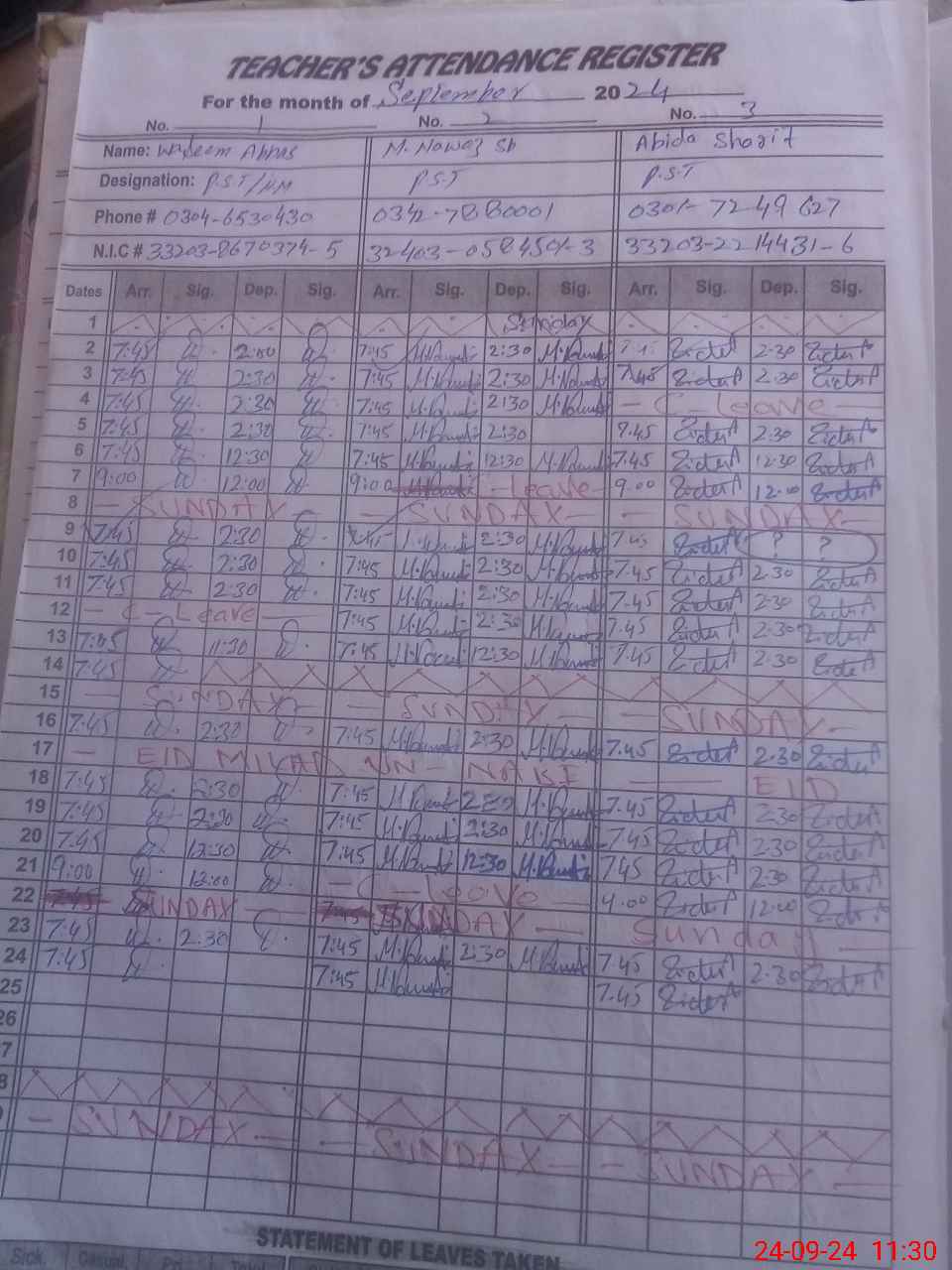 | CNIC | Full Name | Designation | R/C | Absence During Last Calender Month |