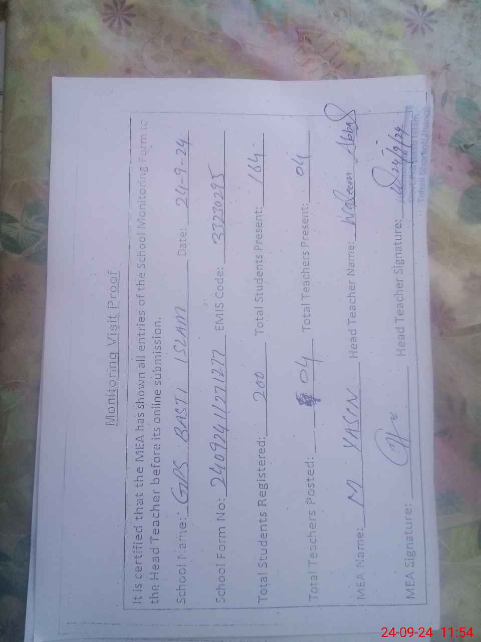 | Attendance Register | Head Teacher | MEA with School | Visit Proof |
