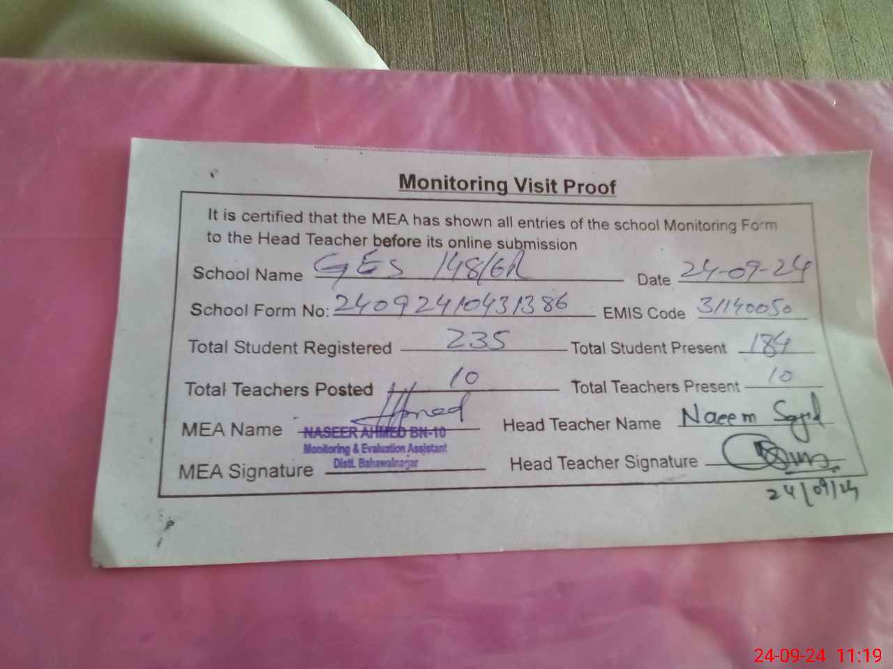 | EMIS Code: 31140050 | Name of School: GES CHAK NO. 148/6-R | |||