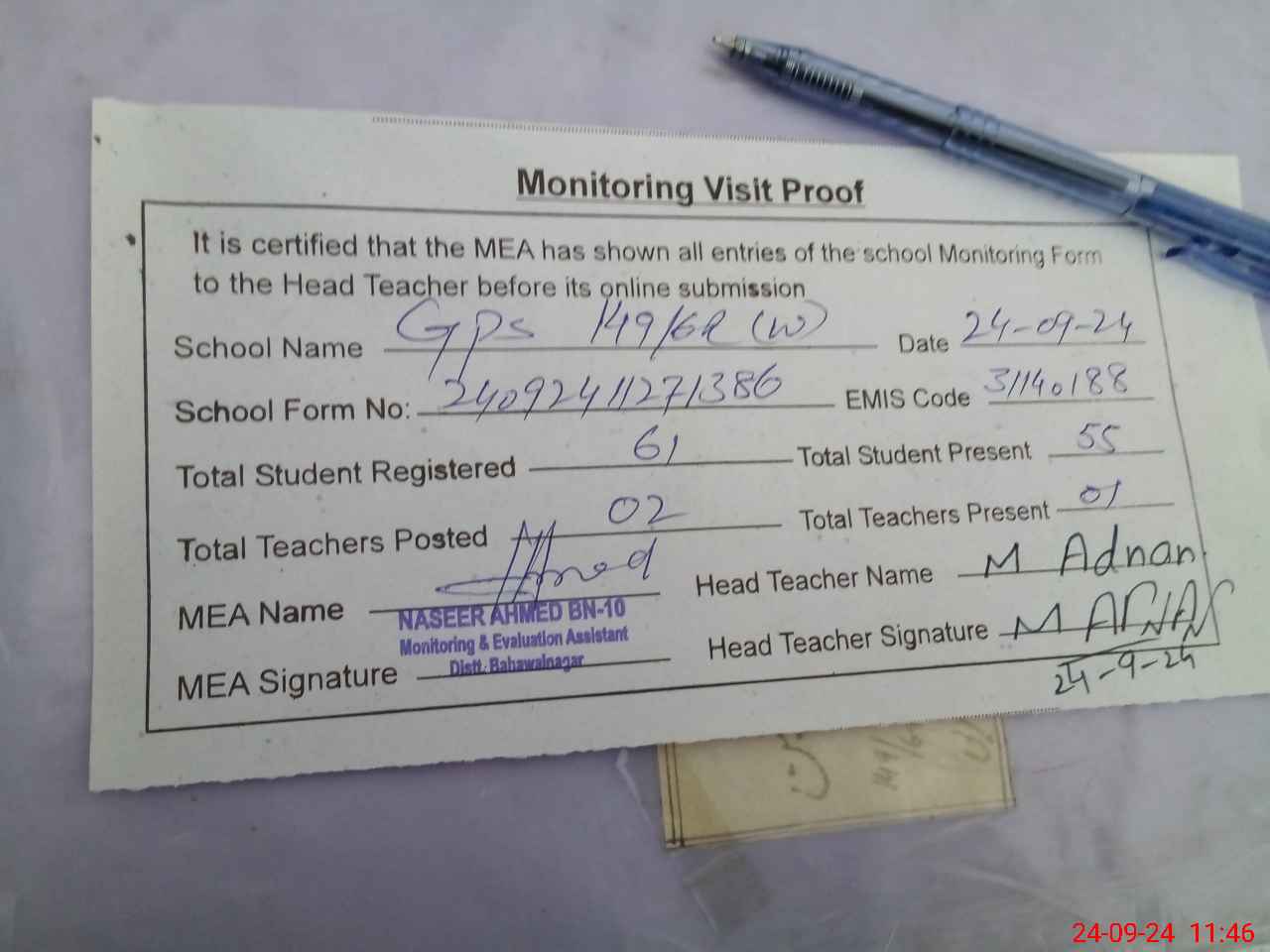 | Attendance Register | Head Teacher | MEA with School | Visit Proof |
