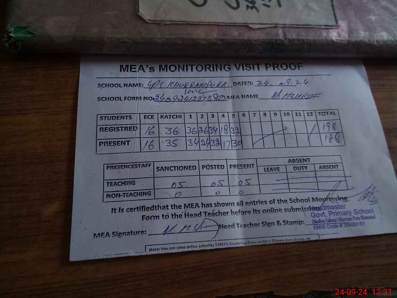 | Attendance Register | Head Teacher | MEA with School | Visit Proof |