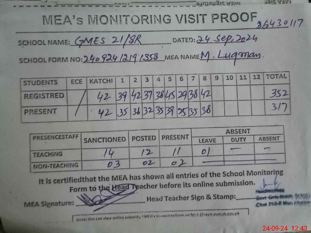 | Attendance Register | Head Teacher | MEA with School | Visit Proof |
