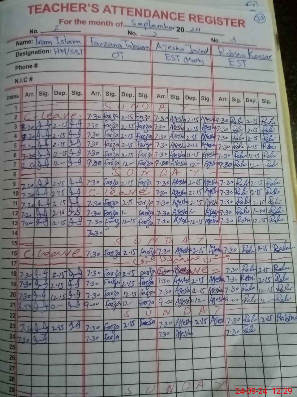 | CNIC | Full Name | Designation | R/C | Absence During Last Calender Month |