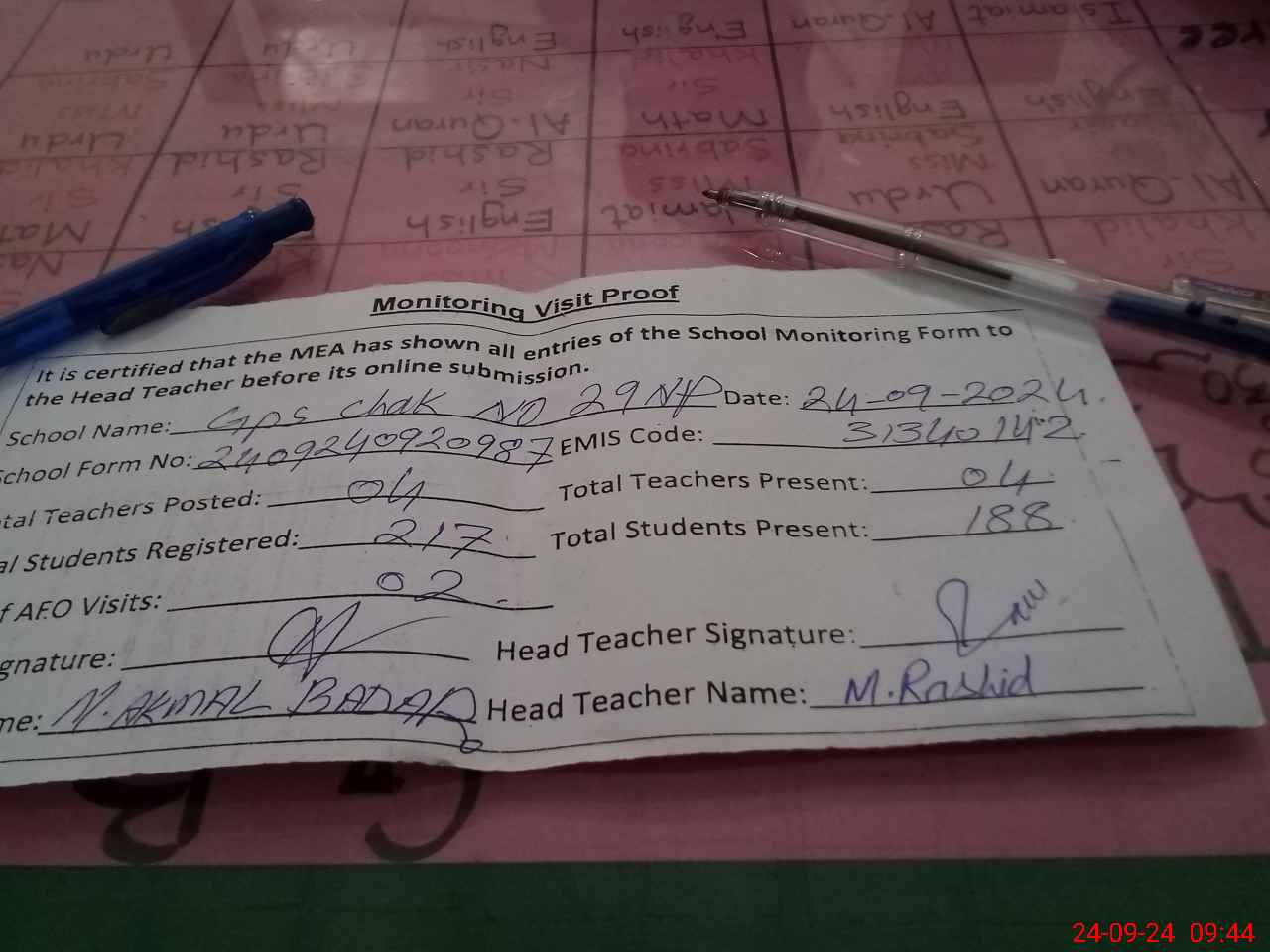 | Attendance Register | Head Teacher | MEA with School | Visit Proof |
