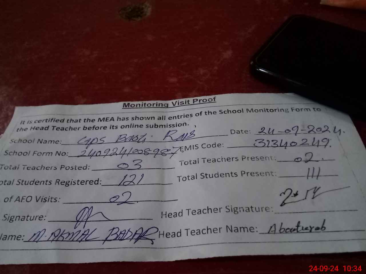 | Attendance Register | Head Teacher | MEA with School | Visit Proof |