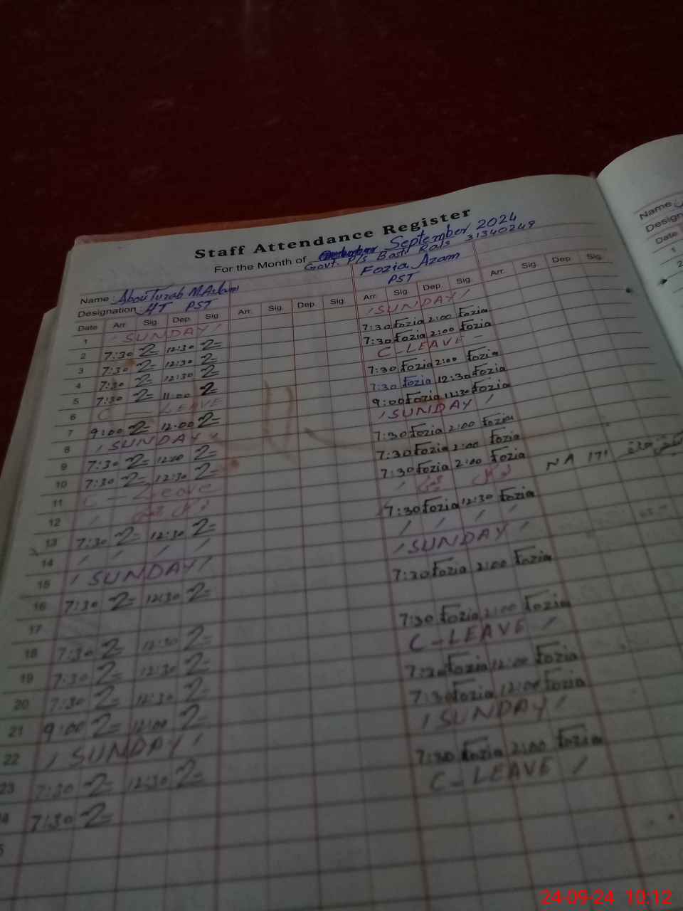 | CNIC | Full Name | Designation | R/C | Absence During Last Calender Month |