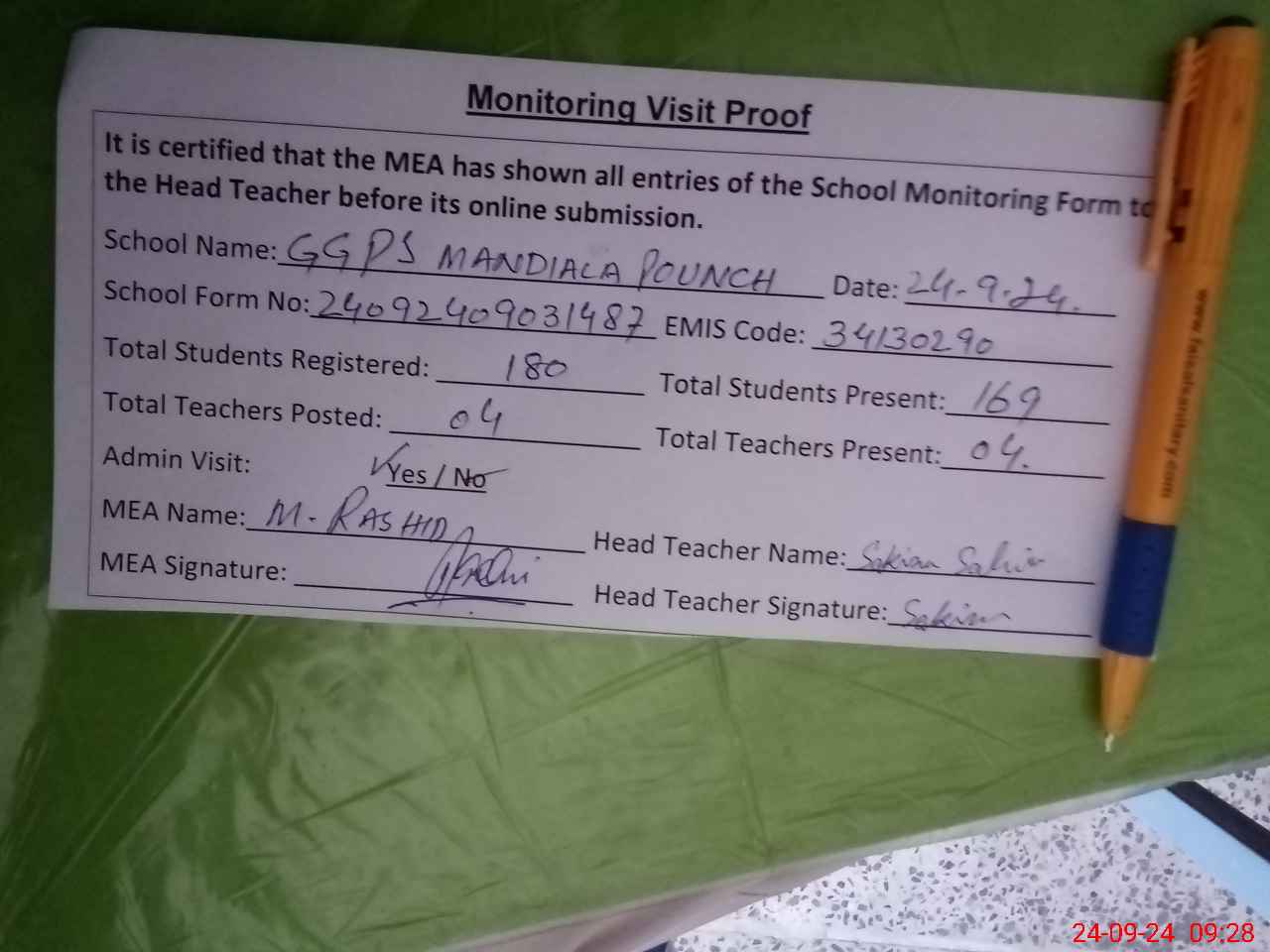 | Attendance Register | Head Teacher | MEA with School | Visit Proof |