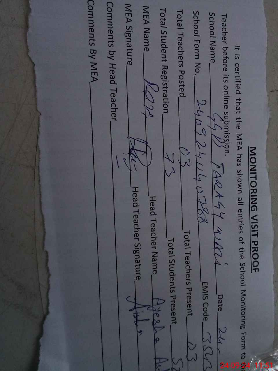 | Attendance Register | Head Teacher | MEA with School | Visit Proof |