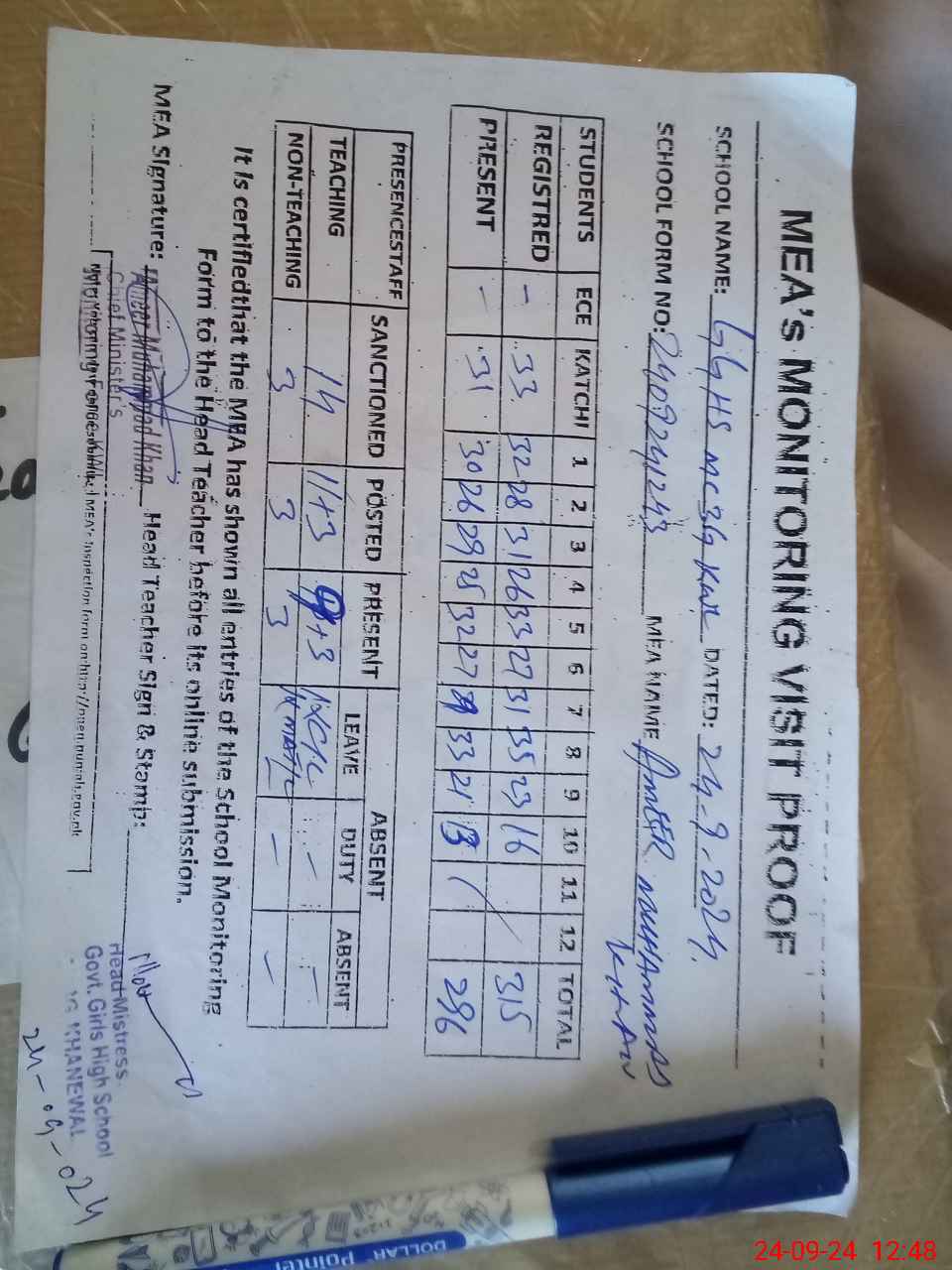 | Attendance Register | Head Teacher | MEA with School | Visit Proof |