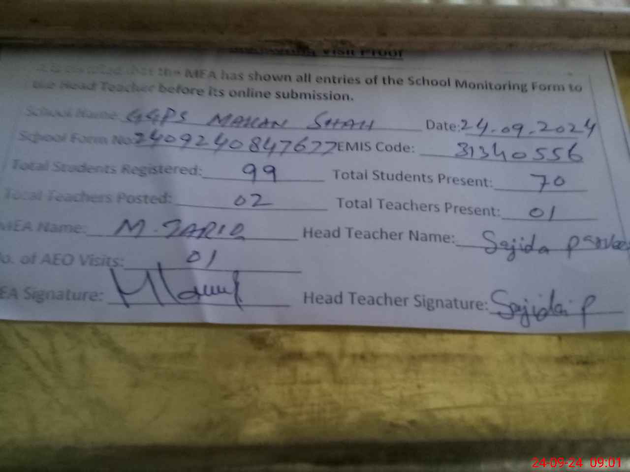 | Attendance Register | Head Teacher | MEA with School | Visit Proof |