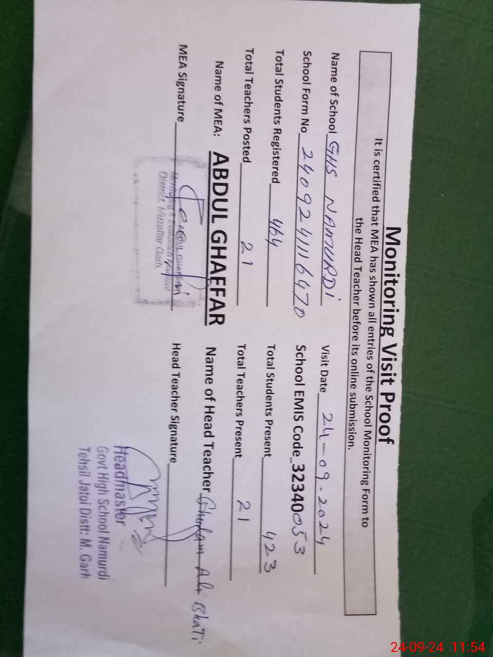 | Certified that this School was Inspected by the Undersigned MEA/DMO Today and the Information Stated Above is as Per Record. | |||||