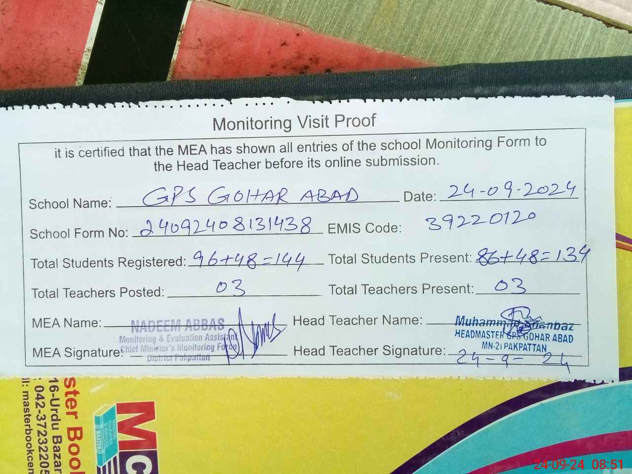 | Attendance Register | Head Teacher | MEA with School | Visit Proof |