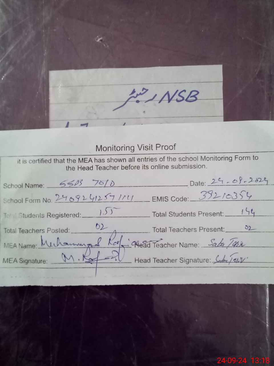| Attendance Register | Head Teacher | MEA with School | Visit Proof |