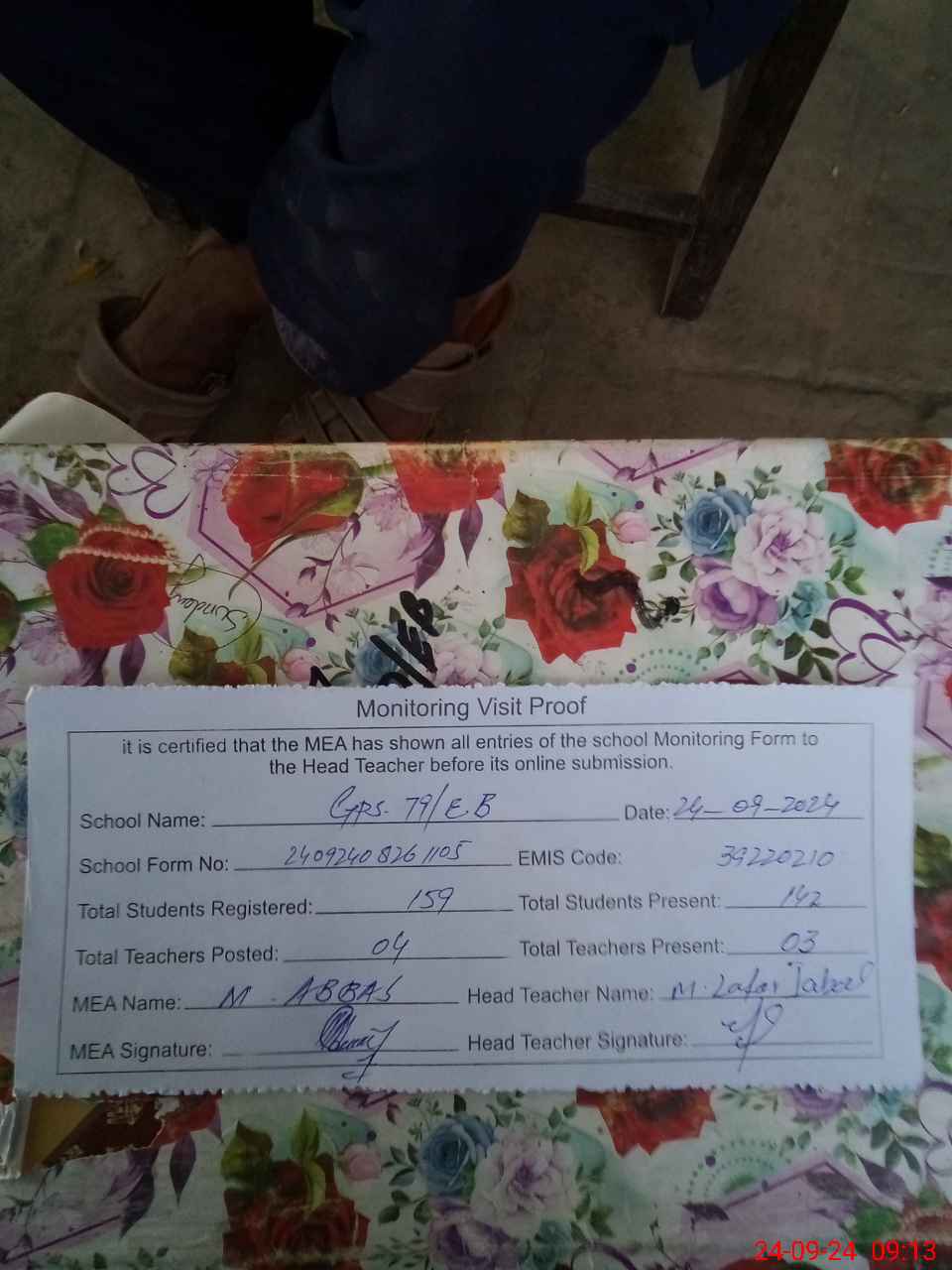| Attendance Register | Head Teacher | MEA with School | Visit Proof |
