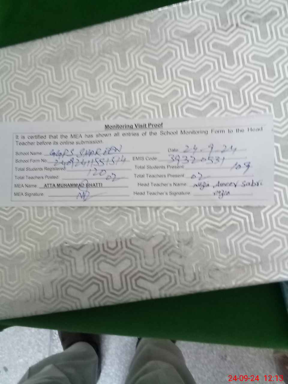 | Attendance Register | Head Teacher | MEA with School | Visit Proof |