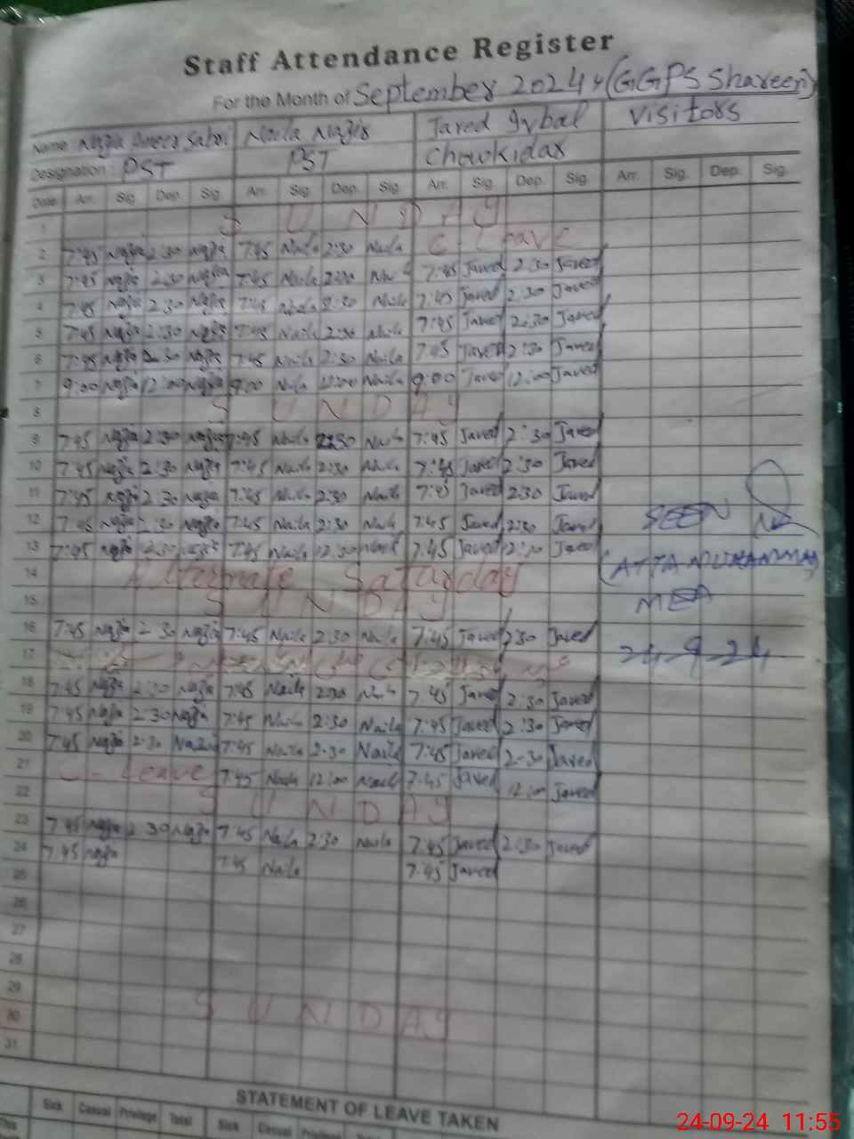 | CNIC | Full Name | Designation | R/C | Absence During Last Calender Month |