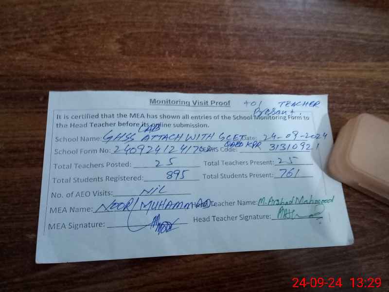 | Certified that this School was Inspected by the Undersigned MEA/DMO Today and the Information Stated Above is as Per Record. | |||||