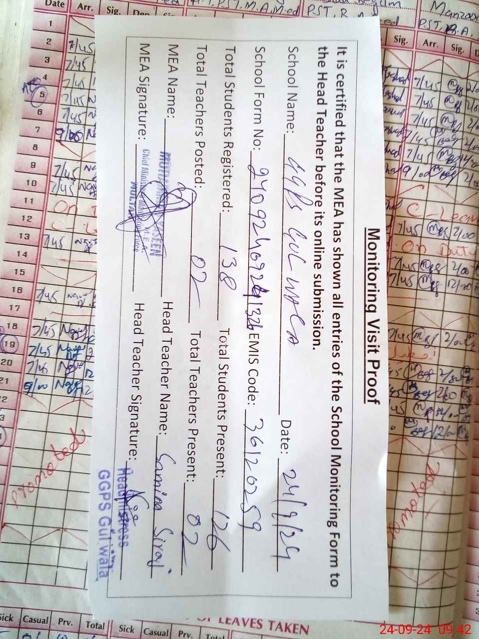| Attendance Register | Head Teacher | MEA with School | Visit Proof |