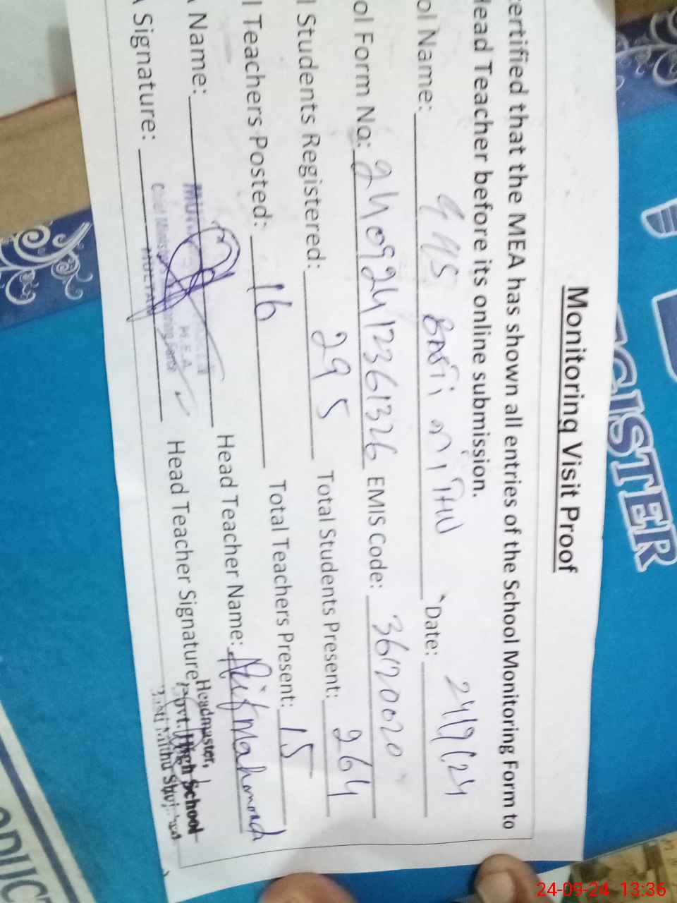 | Attendance Register | Head Teacher | MEA with School | Visit Proof |