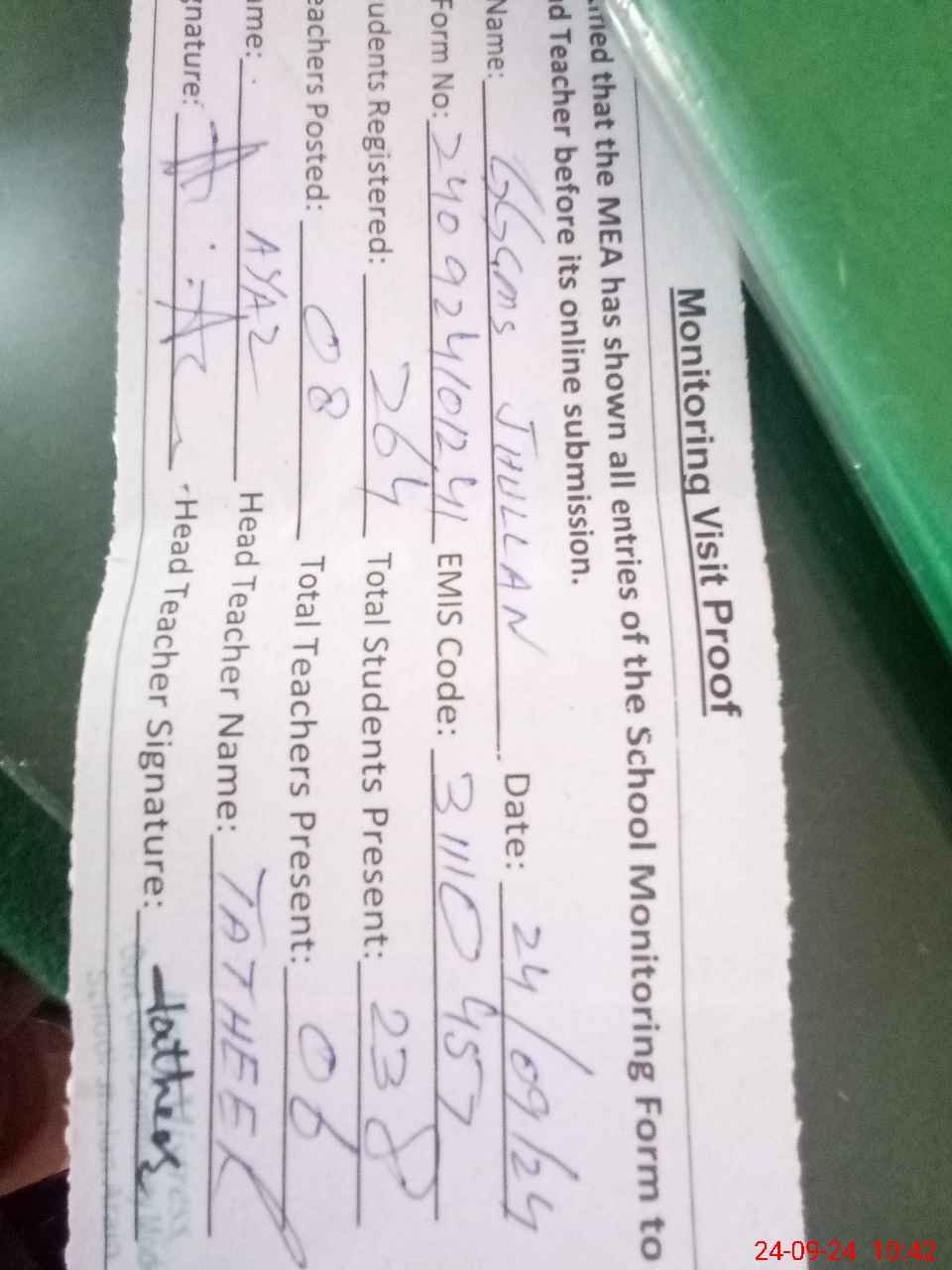 | Attendance Register | Head Teacher | MEA with School | Visit Proof |