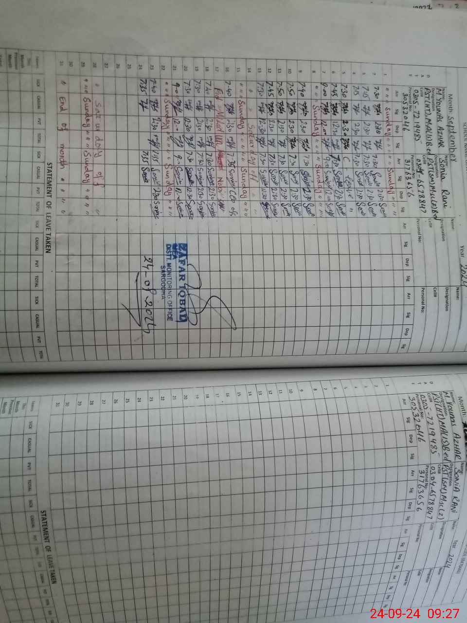 | Monitoring Date: 24-09-2024 | Start Time: 24-09-2024 09:07 AM | End Time: 24-09-2024 09:28 AM | Name of MEA: ZA**** IQ**** | |