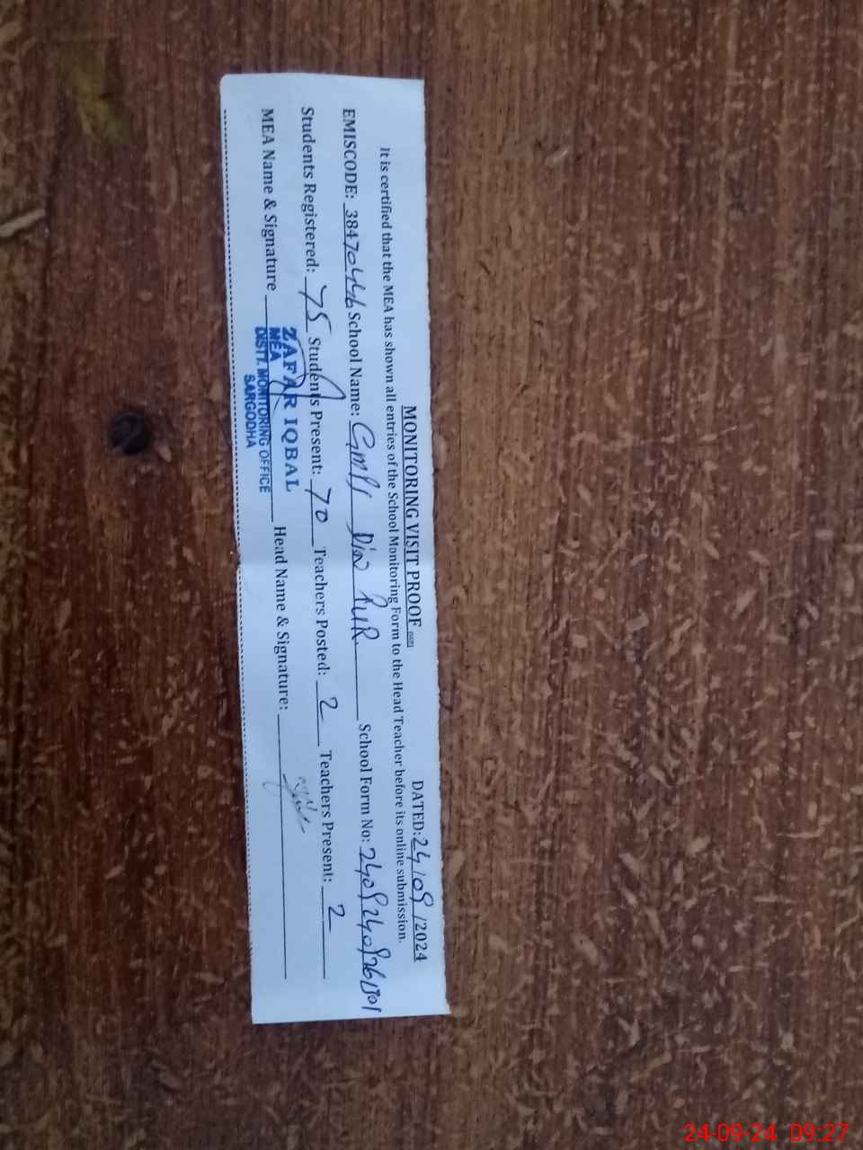 | Attendance Register | Head Teacher | MEA with School | Visit Proof |