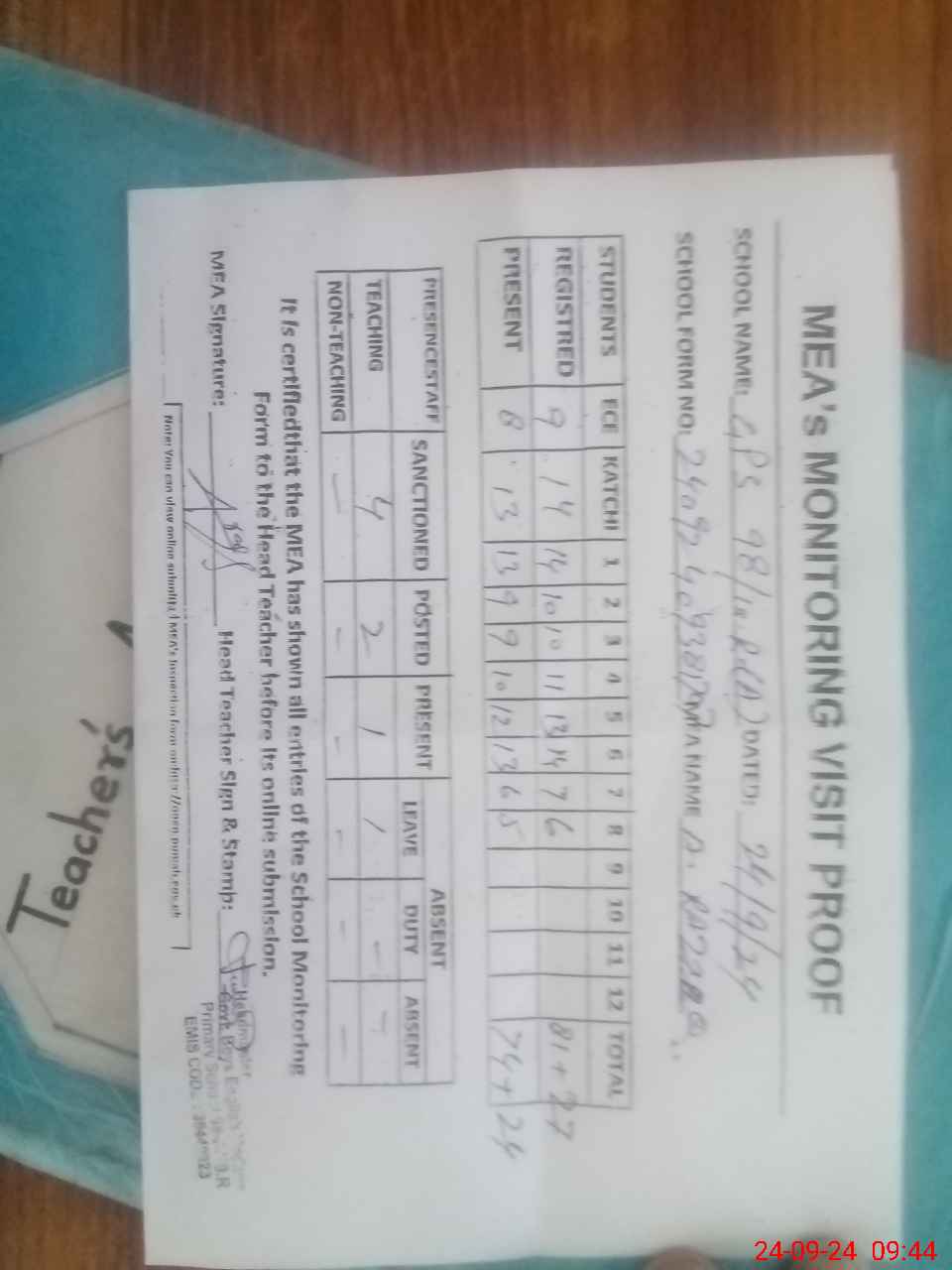 | Attendance Register | Head Teacher | MEA with School | Visit Proof |