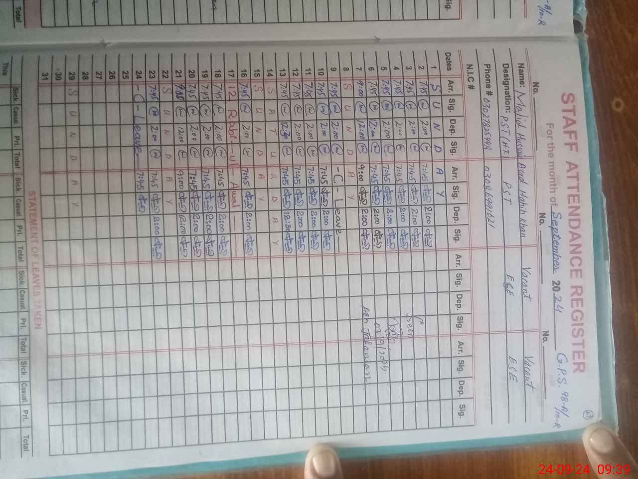 | Name: SH**** RA**** Designation: (School Headmaster's/Headmistress's) PST Phone/Cell Number: 03**** |