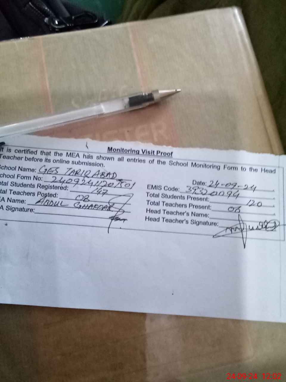 | Attendance Register | Head Teacher | MEA with School | Visit Proof |