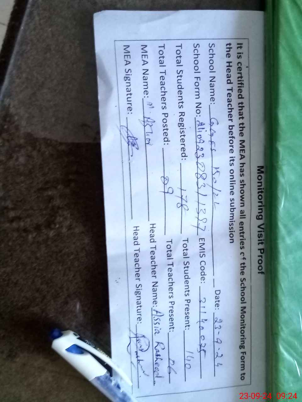 | Attendance Register | Head Teacher | MEA with School | Visit Proof |