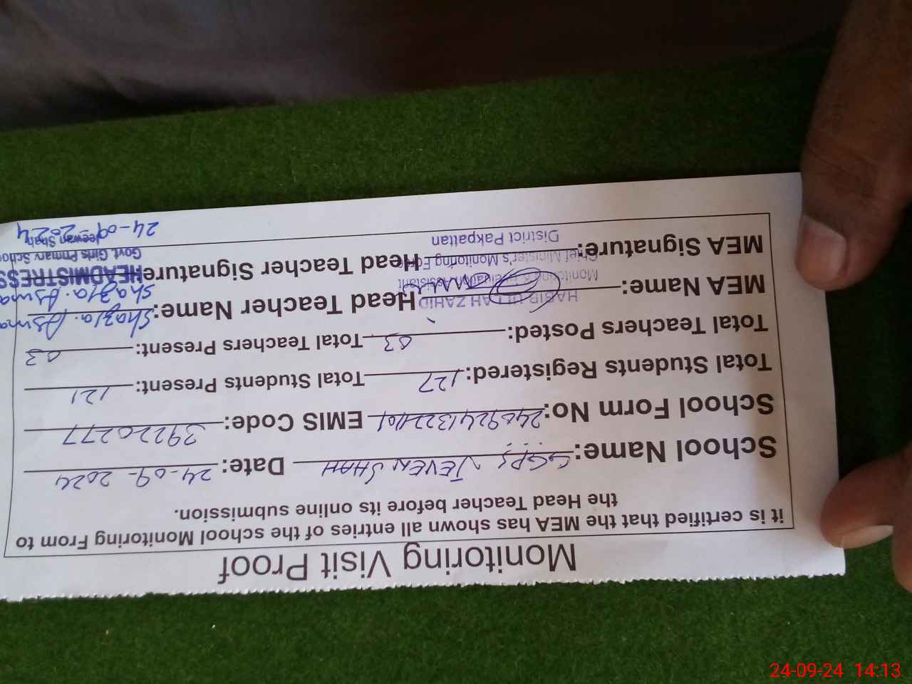 | Name: SH**** AS**** Designation: (School Headmaster's/Headmistress's) PST Phone/Cell Number: 03**** |