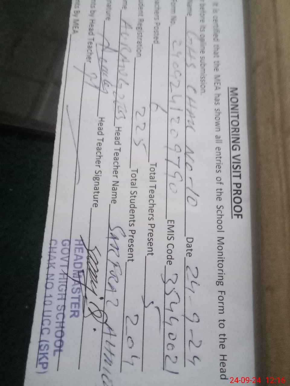 | EMIS Code: 35440021 | Name of School: GHS CHAK NO. 10 UCC | |||