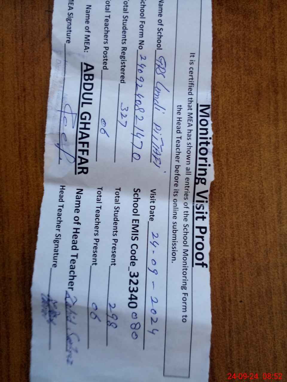 | Attendance Register | Head Teacher | MEA with School | Visit Proof |