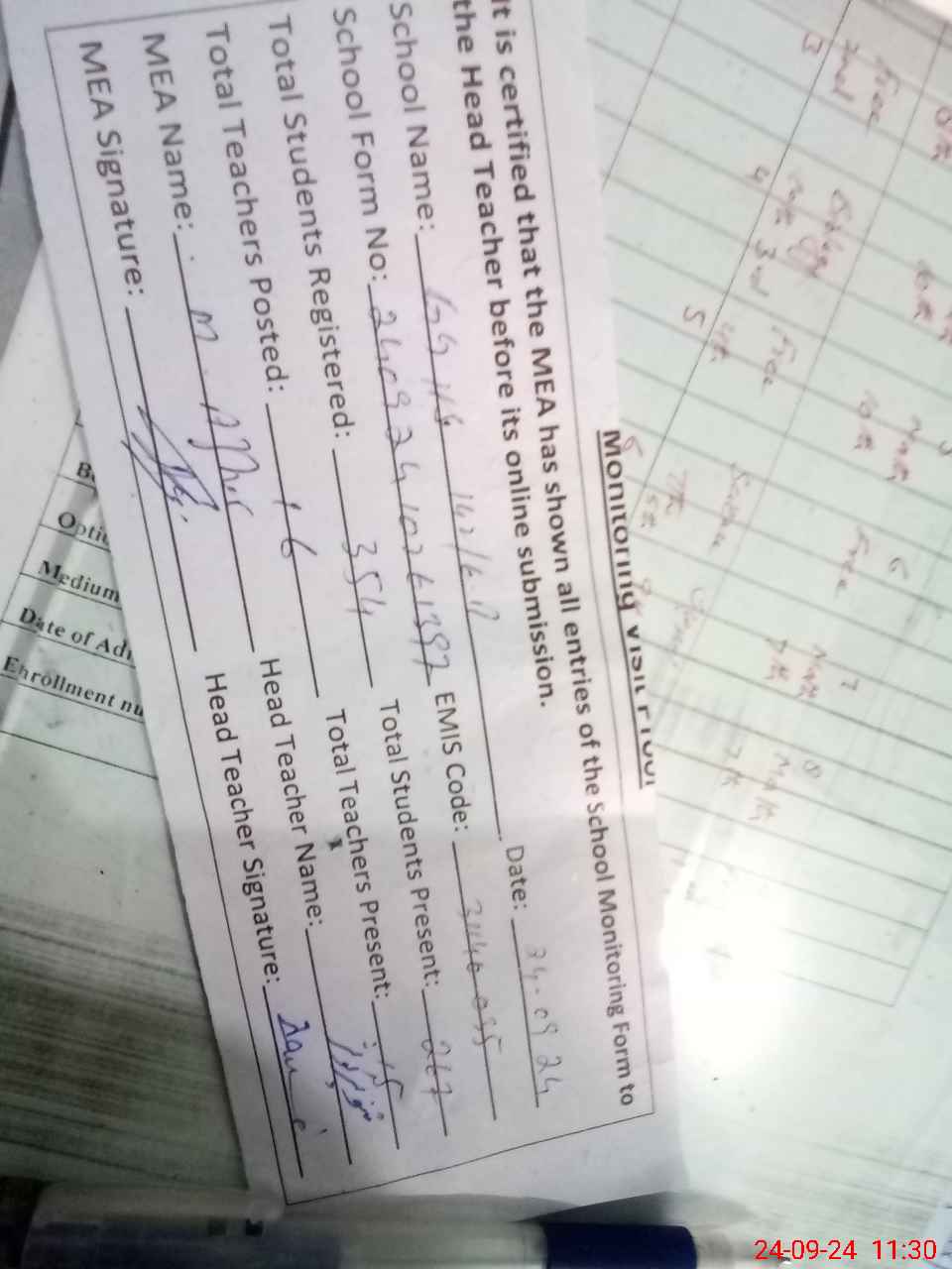 | Remarks (Use Separate Page if Required): NSB AND FTF RECOED NOT SHOWN TO MEA AND THERE IS NO APPROVED LEAVE OF TEACHER Almas Arshad on sis or HRM FROM 20 JULY 2024 TO TILL DATE and free text books record not shown to mea | |||||