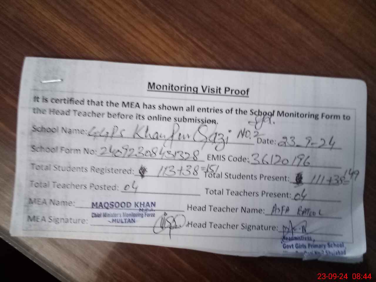 | Monitoring Date: 23-09-2024 | Start Time: 23-09-2024 08:32 AM | End Time: 23-09-2024 08:46 AM | Name of MEA: MA**** ULHA**** KH**** | |