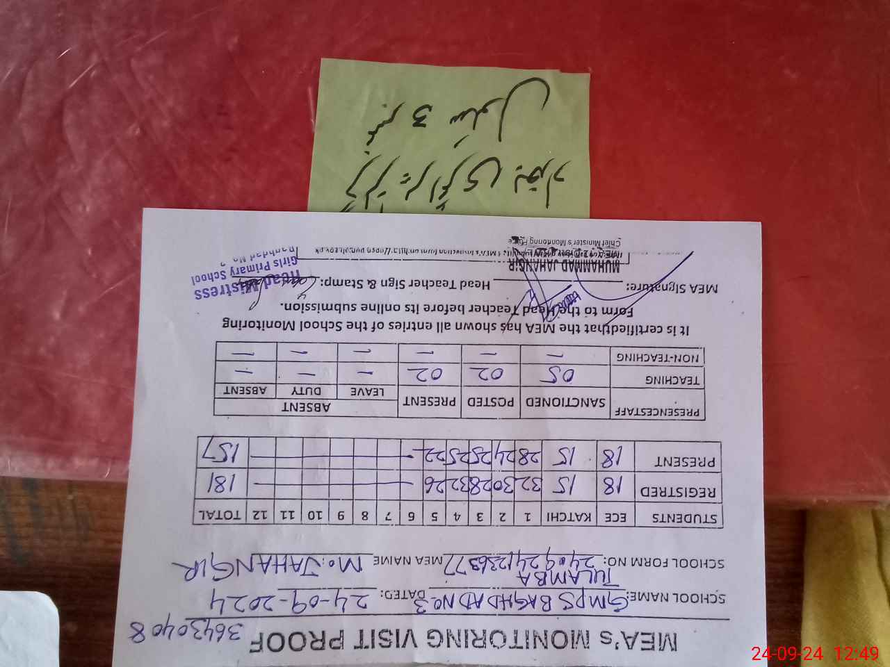 | Attendance Register | Head Teacher | MEA with School | Visit Proof |