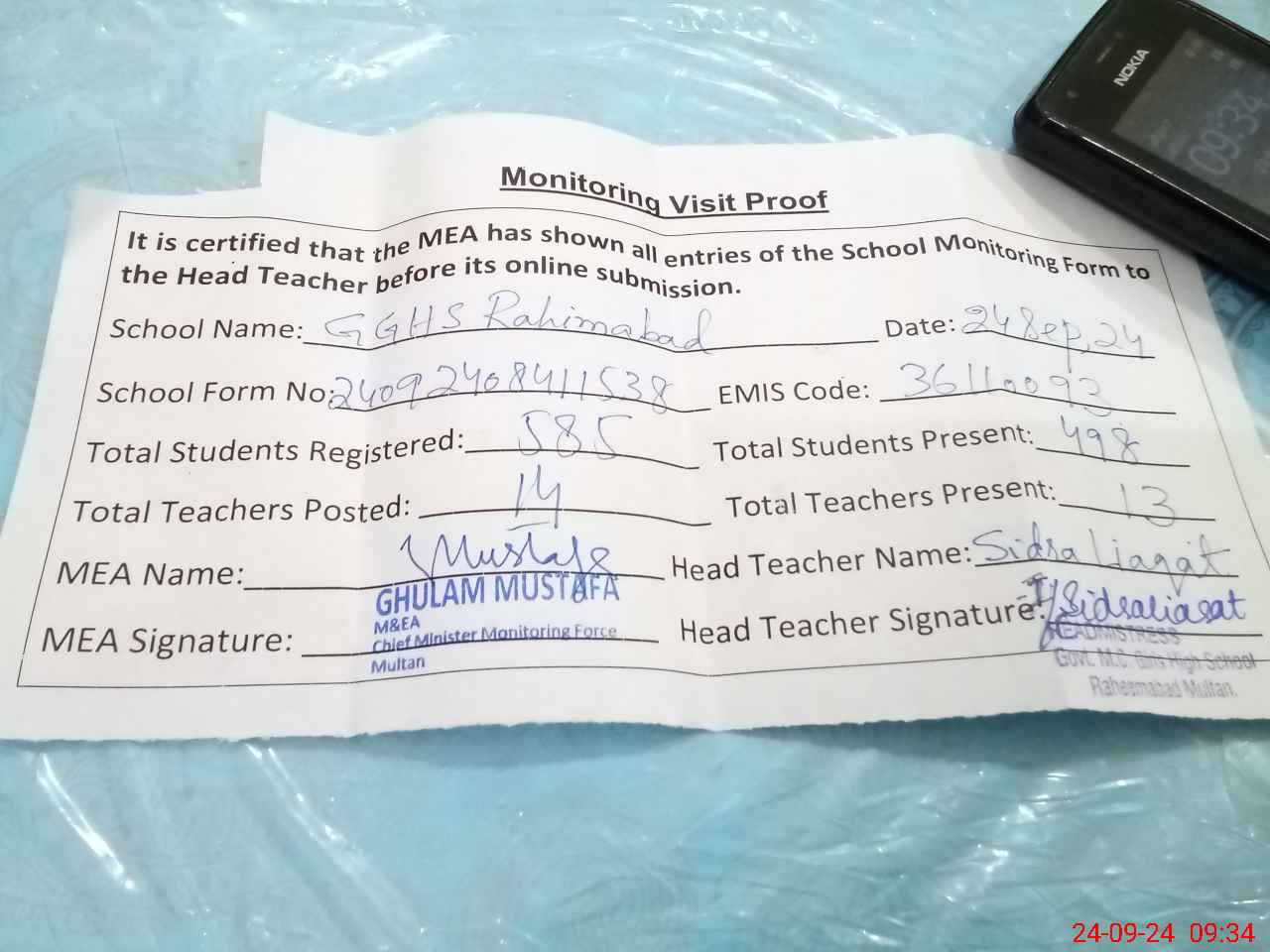 | EMIS Code: 36110093 | Name of School: GGHS MC RAHIM ABAD MULTAN | |||