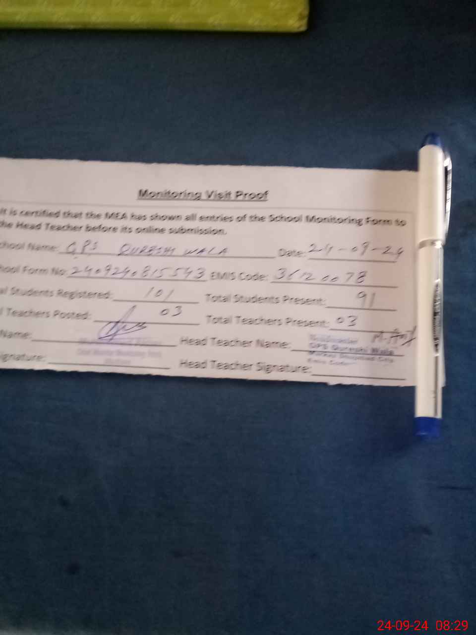 | Attendance Register | Head Teacher | MEA with School | Visit Proof |
