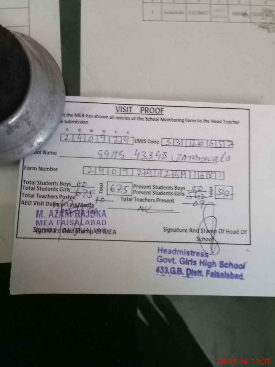 | Attendance Register | Head Teacher | MEA with School | Visit Proof |