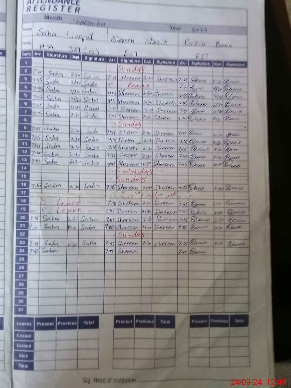 | Leave | Duty | Absent | Maternity | Medical | Ex- Pak |