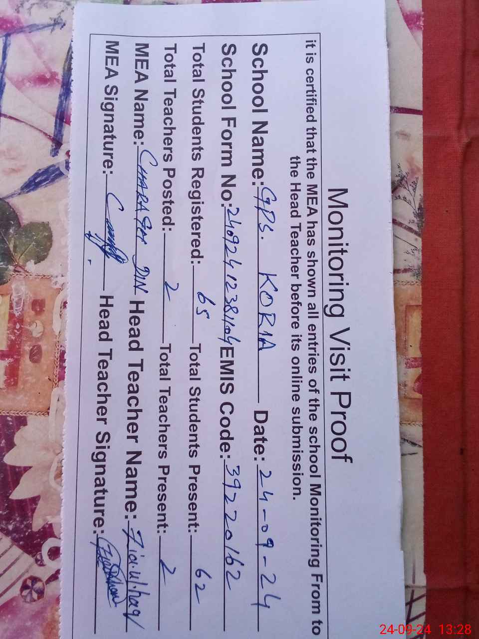 | Attendance Register | Head Teacher | MEA with School | Visit Proof |