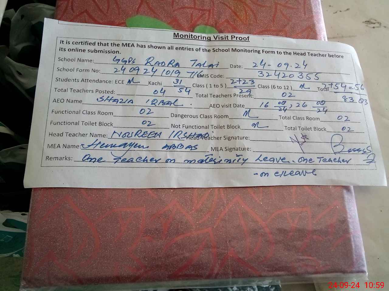 | Remarks (Use Separate Page if Required): One teacher on maternity leave one teacher on casual leave students presence low | |||||