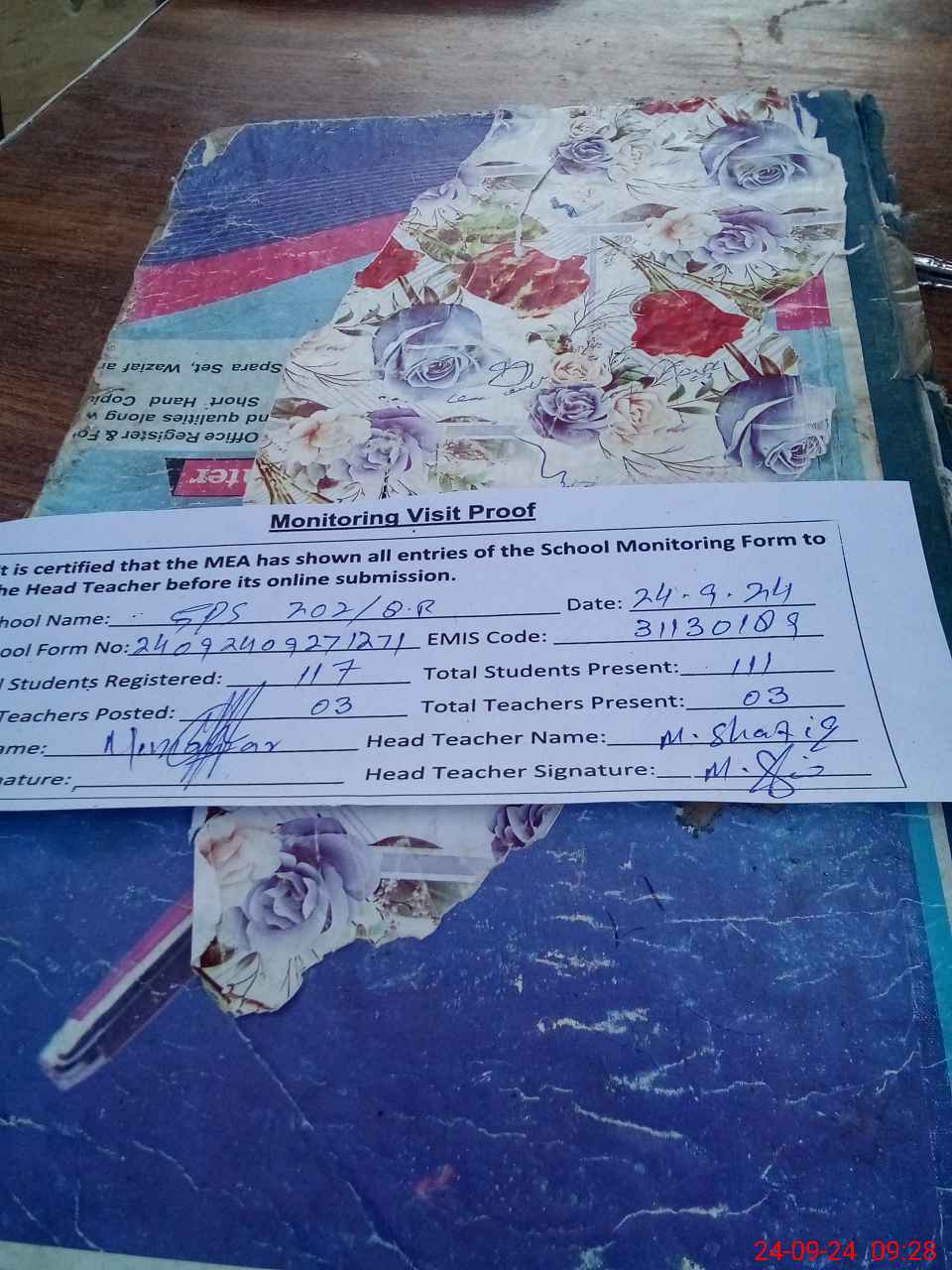 | Attendance Register | Head Teacher | MEA with School | Visit Proof |