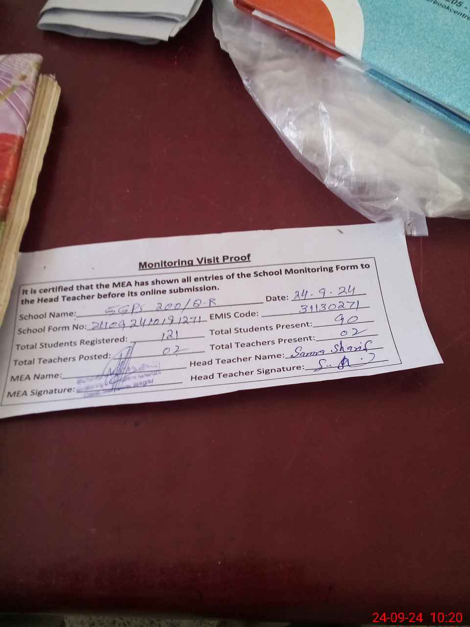 | Attendance Register | Head Teacher | MEA with School | Visit Proof |