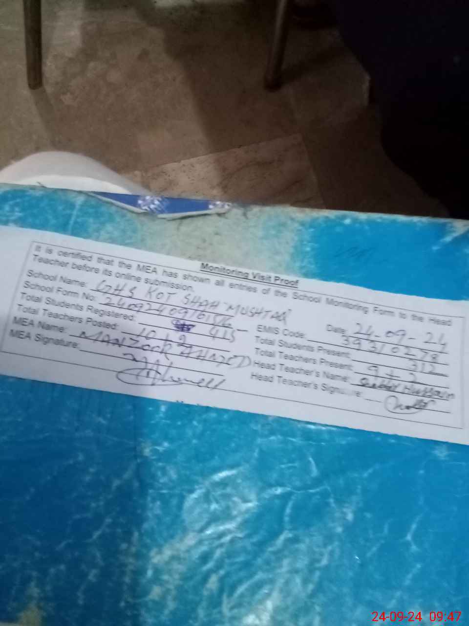 | Attendance Register | Head Teacher | MEA with School | Visit Proof |