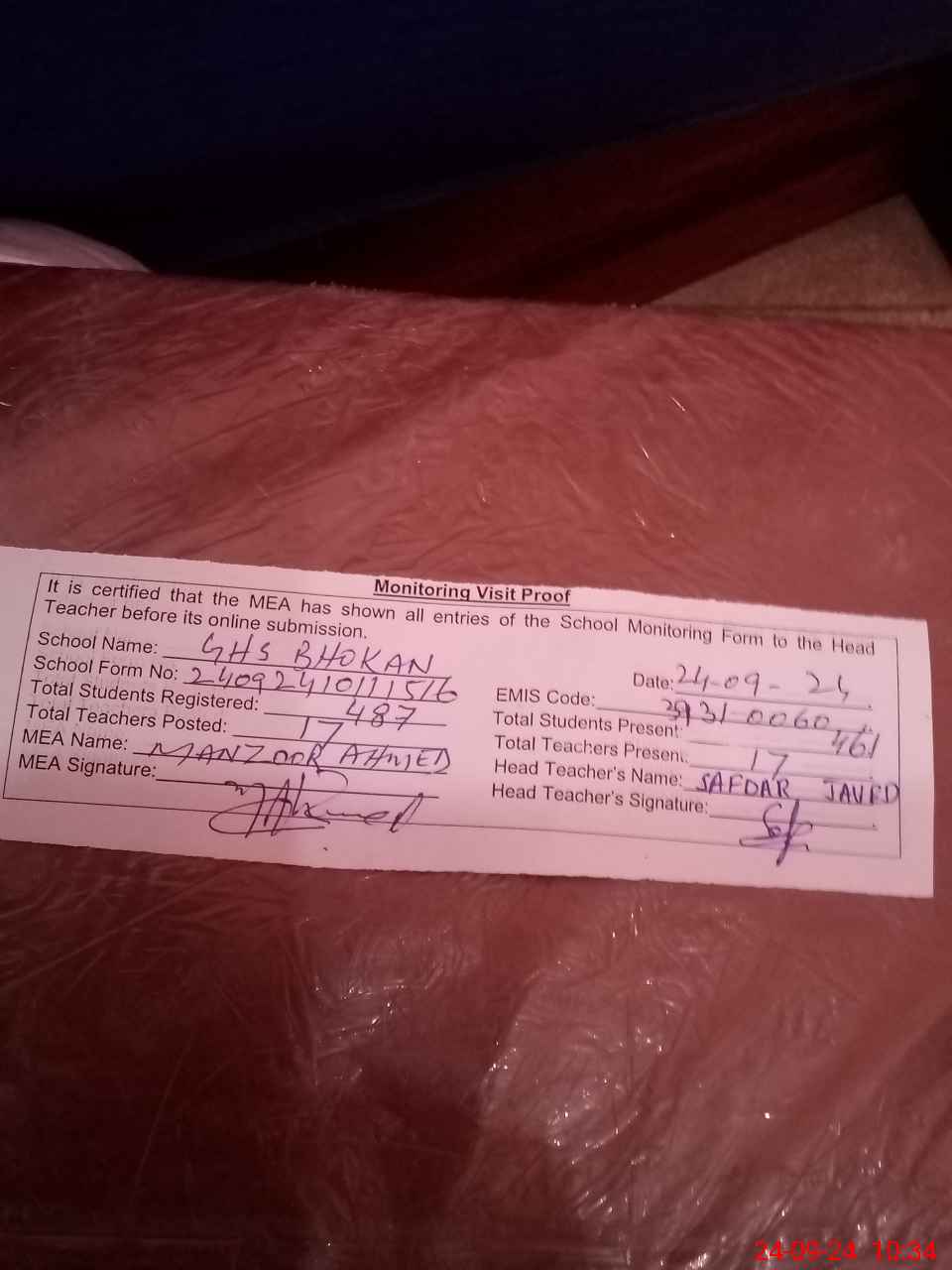 | Monitoring Date: 24-09-2024 | Start Time: 24-09-2024 10:11 AM | End Time: 24-09-2024 10:34 AM | Name of MEA: MA**** AH**** | |
