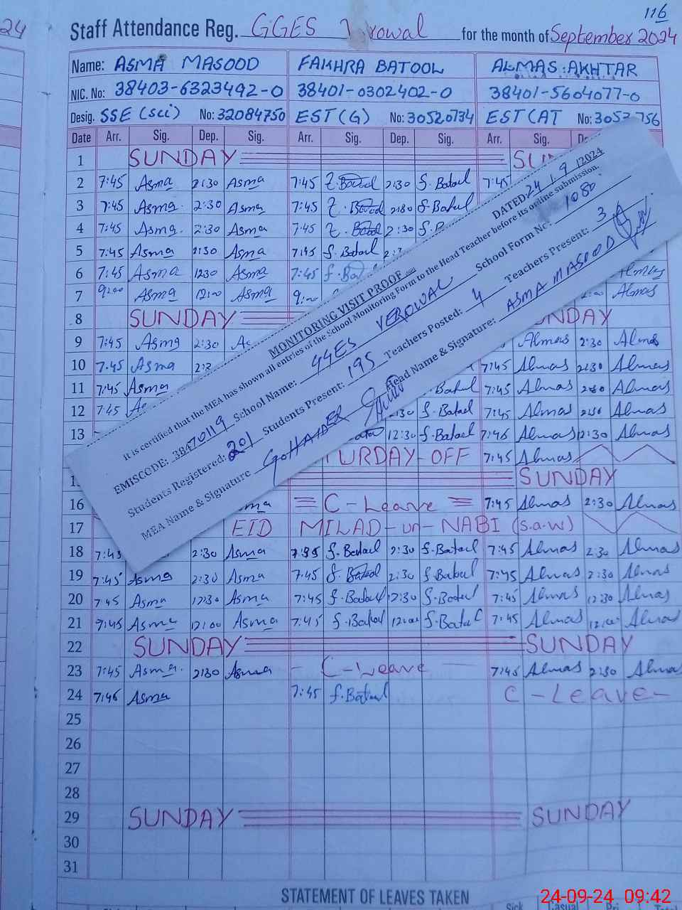 | Monitoring Date: 24-09-2024 | Start Time: 24-09-2024 09:05 AM | End Time: 24-09-2024 09:45 AM | Name of MEA: GH**** HA**** | |