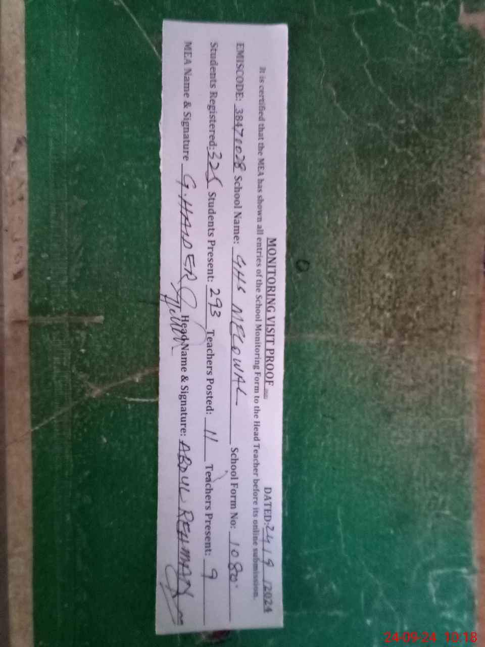 | Attendance Register | Head Teacher | MEA with School | Visit Proof |