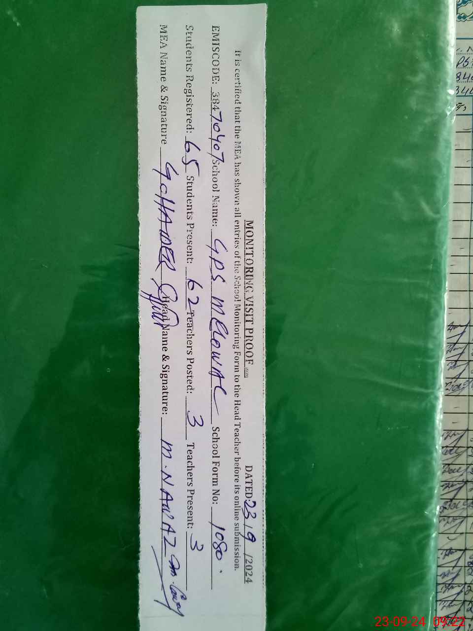 | Attendance Register | Head Teacher | MEA with School | Visit Proof |