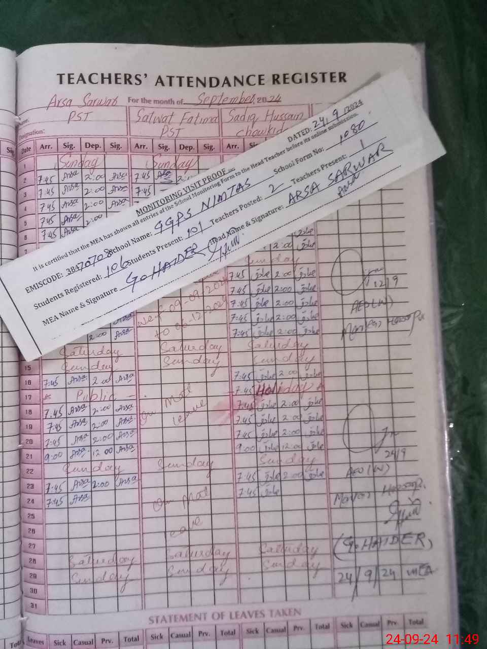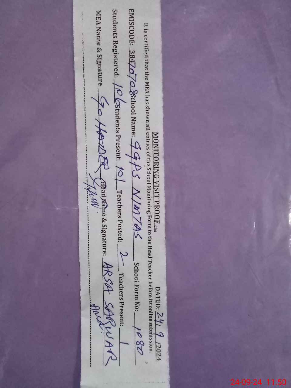 | Attendance Register | Head Teacher | MEA with School | Visit Proof |